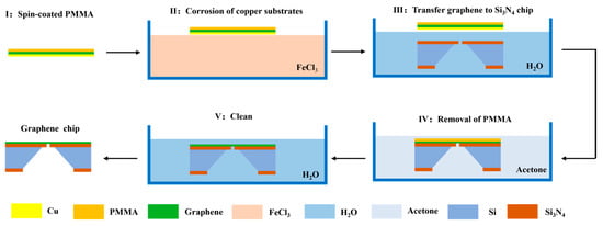 Graphene chips can be obtained by the wet transfer technique using the Si3N4 nanopore chip as the substrate. A single-layer graphene membrane was transferred to the top through the following experimental steps: (I) A piece of copper-based graphene material was provided, and a polymethylmethacrylate (PMMA) membrane was spin-coated on its graphene-covered side using a rotational speed of 2500 r/min and heated at 120 ℃ for 3 min to cure the PMMA membrane. (II) The copper-based graphene with the cured PMMA membrane was attached (copper substrate side down) to the surface of a 2 M FeCl3 solution and etched for 3 min. Then, a dropper was used to draw up the FeCl3 solution, and graphene was rinsed on the back of the copper foil 2–3 times. The copper substrate was left to completely dissolve for 8 h, after which the PMMA membrane and graphene flakes were floating on the surface of the FeCl3 solution. (III) To remove the FeCl3 solution from the backside of the graphene with the cured PMMA membrane, graphene with the cured PMMA membrane was fished from the FeCl3 solution using a clean slide and placed on the surface of deionised water to clean for 30 min. Graphene with the cured PMMA membrane was retrieved from the deionised water using a Si3N4 nanopore chip and annealed for 2 h at 85 °C to ensure that the graphene fit the target chip tightly. (IV) To completely remove the PMMA membrane from the surface of the graphene, the annealed chip was soaked in acetone three times. The first two soakings were performed for 30 min, and the third soaking was performed for 8 h. (V) To remove the acetone from the surface of the chip, the chip was placed in deionised water for 5 min and dried at 60 °C in an oven to obtain a graphene chip with a clean surface. A flowchart of the transfer process of the graphene membrane chip is shown in Figure 2.