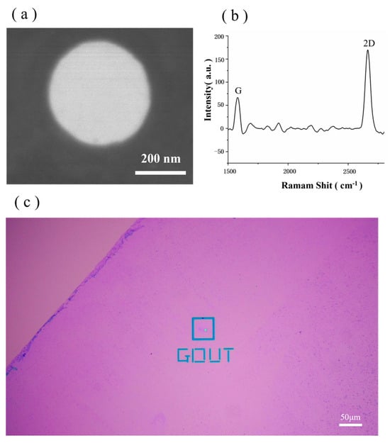 In this study, images obtained using HIM and Raman spectroscopy are used to characterise the graphene chip. As shown in Figure 3a, the HIM image shows that the graphene surface is complete, clean and bright. Furthermore, Raman spectroscopy is an ideal analytical tool for characterising graphene, and the structural features and properties of graphene, such as the number of layers, stacking mode and defects, can be determined by recording the Raman spectra of the material []. A 532 nm band laser was used to collect information on the number of layers in the graphene chip, and the results are shown in Figure 3b. In the figure, the G peak is roughly located at 1592 cm−2, and the shape of this peak is sharp. The 2D peak is roughly located at 2710 cm−1. The ratio of the G peak to the 2D peak is less than 1; thus, it can be determined that the graphene transferred to the Si3N4 substrate is in a single layer. Figure 3c shows an optical microscope image of the chip after the graphene transfer, and a clear difference between the graphene-covered area and the graphene-uncovered area is detected in the image (the triangular area in the upper left corner). It is clear to see that the larger graphene membrane covers on the membrane in the blue box in Figure 3c are where graphene nanopores will be created. In this experiment, the success rate for transferring graphene to the Si3N4 chip can reach 80% following the aforementioned steps.