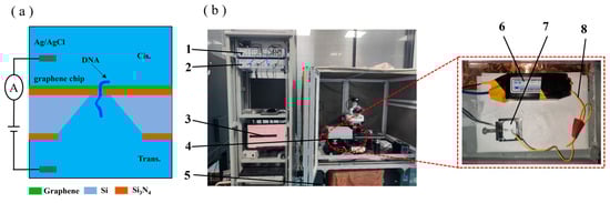 A working principle diagram of the nanopore sensor is shown in Figure 4a. The 0.1 M KCl solution was added to the flow cell. The Ag/AgCl electrode was connected to a membrane clamp (Axon 700B, Molecular Devices, Shanghai, China). The inspection system of the diaphragm clamp is shown in Figure 4b. The voltage was applied to the trans side to conduct a blanking test with a sampling time of 2 min to ensure that the prepared graphene nanopores were free of contaminating signal sources. The 0.1 M KCl solution was removed from the cis side of the flow cell, and a 20 nM DNA solution was added. Then, a voltage of 200 mv was applied to the trans side, and the cis side was grounded. Finally, the signal of the DNA molecule passing through a nanopore was recorded. The experimental data were statistically analysed using Clampfit 10.7.0.3, Excel 2019 and Origin software 2018.