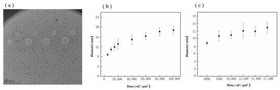 Ion beam processing is only related to the total delivered dose during processing, independent of the beam current; thus, the processing dose is used in this study to quantify the degree of processing. A diaphragm (20 µm) was used to control the ion beam during processing, and the processing beam current was −1.5 pA with a residence time of 2000 µs. Graphene nanopores with an average diameter range of 8.82–18.79 nm were obtained in the processing dose range of 5000–100,000 nC/µm2. Figure 5 shows the TEM image of a graphene nanopore fabricated via HIM at different doses. Figure 5a shows the relationship between the size of the graphene nanopore and the ion dose in the range of 5000–100,000 nC/µm2. The growth of the graphene nanopore undergoes two stages as the ion dose increases. In the low dose range of 5000–17,500 nC/µm2, the graphene pore size grows linearly with the increase in the ion dose, as shown in Figure 5c. However, with a further increase in the ion dose, the growth of the nanopore size slows down in the range of 17,500–100,000 nC/µm2.