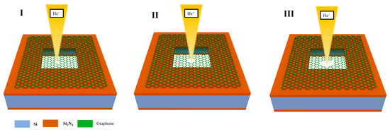 This phenomenon can be explained by the model of graphene nanopores etched using helium ions shown in Figure 6. The process of generating nanopores through the etching of graphene using helium ions can be divided into three stages. In the first stage, the defects in graphene created by the action of the helium ions will interact with the deposition of hydrocarbon contaminants from the HIB, resulting in the healing and reweaving of the defects []. Therefore, helium ions have a negligible effect on graphene at low doses. However, as the etching dose increases, Frenkel and Stone–Wales defects are created in the graphene. Frenkel defects are caused by the carbon atoms colliding with the helium ions, resulting in the displacement of the carbon atoms from their original region, forming a pair of vacancies and interstitial atoms. In the Stone–Wales defects, the C–C bonds of graphene atoms are exposed to helium ions and rotated by 90°, which results in the rearrangement of the four adjacent hexagonal carbon lattices into two pentagonal and two heptagonal carbon lattices []. At this stage, mainly localised defects are produced.