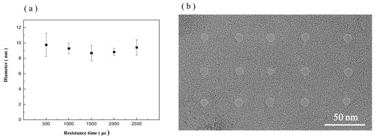 The longer the dwell time is, the more concentrated the dose in a single delivery. The shorter the residence time is, the more dispersed the dose in a single delivery. However, this change does not affect the total delivered dose. In this study, the effects of different dwell times on graphene nanopore processing were investigated. Graphene nanopore processing was conducted using dwell times of 500, 1000, 1500, 2000 and 2500 µs with a diaphragm of 20 µm, an HIB current of 1.5 pA and a dose of 5000 nC/µm2. The processing results are shown in Figure 7a. The average pore diameters of the nanopores processed using a dwell time of 500–2500 µs are 9.77, 9.31, 8.07, 8.84 and 9.43 nm. The relationship between pore size and different dwell times is shown in Figure 7a, and the TEM images of the nanopores fabricated via HIM at different dwell times are shown in Figure 7b. The diameters of the processed nanopores vary within 1.7 nm, and no significant relationship between graphene nanopore diameter and dwell time is observed. Although the residence time varied, it did not meaningfully affect the total dose of helium ions acting on the graphene.