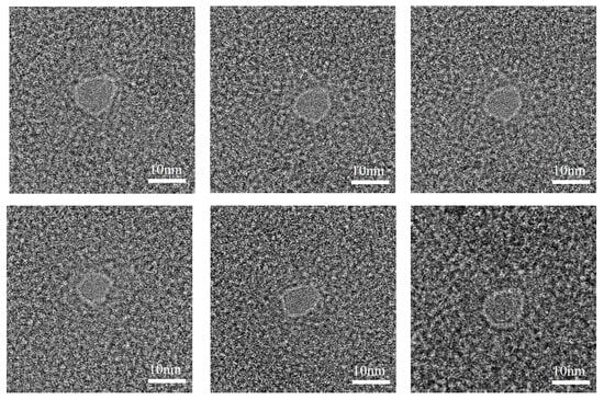The fabrication of graphene nanopores via HIM harnesses the energy transferred to the carbon atoms in graphene when they collide with high-energy ions, causing the carbon atoms to be sputtered out of the surface of the material, resulting in the formation of the nanopore []. The graphene nanopores were processed using the point processing mode of the HIM with a beam current of 1.5 pA and different processing doses and dwell times. The graphene nanopores were characterised via TEM. The point processing mode was selected because, in this mode, the beam spot acts on only one point, and the theoretically processed pore size is small for the area processing mode. The point processing mode was selected to maintain the beam current at a smaller value (1.5 pA) because, during the machining process, the graphene membrane at the window aperture must be imaged to locate the machining area, and a larger beam current will cause damage to the graphene, leading to the rupture of the graphene membrane. The graphene material is thin and does not require a large dose to achieve nanopore processing; thus, a small beam current will not affect the processing efficiency.