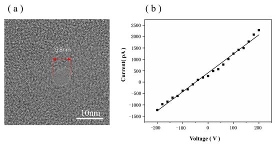 (a) TEM image of the graphene nanopore chip used for detection. (b) IV plots of graphene nanopore.