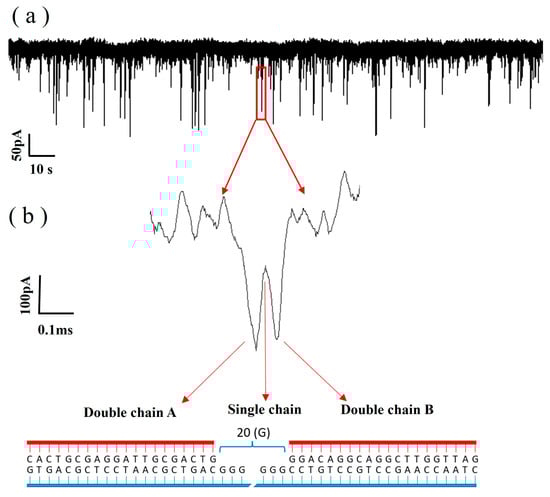 Using Equation (3), the diameter of the graphene nanopore was determined to be 5.8 nm, which is suitable for use in DNA molecule detection. The ionic current trace at a 100 mV bias voltage is shown in Figure 10a, in which the pulse signals indicate the events corresponding to DNA translocation through the pore from the cis chamber to the trans chamber. Figure 10b shows one of the signals in the ionic current trace, which is a double-peaked signal and is related to the structure of the DNA. Figure 10b shows the structure of the DNA, which is synthesised from an ssDNA strand with two probes; thus, the structure is ‘dsDNA A–ssDNA–dsDNA B’. When dsDNA A passes through the graphene nanopore, the blockage of the double strand increases the signal drop. When the ssDNA region passes through the graphene nanopore, only a volume equivalent to half of the diameter of the dsDNA blocks the ions in the nanopore, resulting in a decrease in the signal drop. When dsDNA B passes through the graphene nanopore, the same effect as that of dsDNA A can be observed; thus, the double-peak signal appears, as shown in Figure 10b. Therefore, the appearance of the double-peak signal confirms that the ‘dsDNA A–ssDNA–dsDNA B’ structure successfully passed through the graphene nanopore.