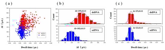 A total of 280 bimodal signals were selected and counted, and three peaks of these bimodal signals were counted separately. The two downward peaks represent dsDNA passing through the graphene nanopores, and the upward middle peak represents ssDNA passing through the graphene nanopores. Figure 11a presents a scatter plot of translocation dwell time versus current blockade, ∆I, for ssDNA and dsDNA passing through the graphene nanopores. Figure 11b shows the frequency statistics of the blocking current. The blocking current of dsDNA is mainly distributed in the 160–220 pA range, showing certain Gaussian curve characteristics, and the peak Gaussian value is approximately 195 pA. The blocking current of ssDNA is mainly distributed in the 80–140 pA range, and the peak Gaussian value is approximately 102 pA. Figure 11c shows the frequency statistics of the dwell time. The dwell time of dsDNA is mainly distributed in the 20–35 µs range, and the Gaussian peak value is approximately 25 µs. The dwell time of ssDNA is distributed in the 15–30 µs range, and the Gaussian peak value is approximately 22 µs. The DNA hybridisation strand translocates at a rate of 0.7–0.8 µs/base in a 5.8 nm graphene nanopore.
