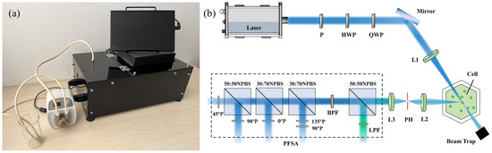 The optical system of the prototype is illustrated in Figure 1b. The light source is a 1 W laser with a wavelength of 445 nm. The incident light becomes linearly polarized after passing through a polarizer (P) and is modulated to a certain polarization state through a half-wave plate (HWP) and a quarter-wave plate (QWP) in sequence. Subsequently, the light beam is focused on the center of sample pool by a convex lens (L1), where individual particles flow through and can be illuminated. The backscattered light at 120° is collected and focused by a convex lens (L2), while unscattered light is eliminated in the beam trap. Note that the backscattered light passes through a circular pinhole (PH), allowing for only the scattering light from individual particles to pass through. Afterward, a convex lens (L3) collimates the light passing through PH, ultimately entering a polarization and fluorescence state analyzer (PFSA), following our previous work [25]. Once entering the PFSA, the light is divided into five portions by unpolarized beam splitter cubes in a certain proportion. One portion of the light passes through a long-pass filter (LPF) ranging from a wavelength of 460 nm to 950 nm, obtaining fluorescence intensity. The remaining four portions are acquired as four polarization components of the light, which can be combined into a vector of polarization components, that is, [I1, I2, I3, I4]T. It is noteworthy that the scattering volume is limited to 0.01 μL, which ensures that only a single particle at most can be counted in the scattering volume, thereby enabling rapid measurement of individual particles [26].