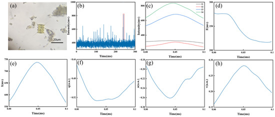 Subsequently, the fluorescence pulse obtained from same cell was averaged as one value F to represent the fluorescence information (Figure 2d). Meanwhile, the Stokes vector, I, q, u, and v, could be calculated (Figure 2e–h). The profile of I was usually similar to the signal of I1. Additionally, the other pulses normalized by I were different from their corresponding signals, which might be subjected to both the energy density distribution of illuminating light and the route that the single cell passed through the scattering volume. Polarization pulses contained more high-dimensional details on the backscattered light than the intensity pulse I, demonstrating great potential for classification. In previous studies, four polarization pulses were usually represented by the pulse-average classification (PAC) method [25], ignoring their pulse features, which might contain a wealth of particle information.