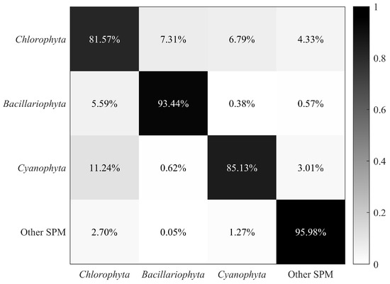 The classification results of microalgae, cyanobacteria, and other SPM are presented as a confusion matrix shown in Figure 4. The classification model had an overall accuracy of 89.03%, with each accuracy larger than 80%. Particularly, Bacillariophyta and other SPM were best classified, with an accuracy larger than 90%, while Chlorophyta had the minimum classification accuracy, which was close to 82%. There remained some misidentifications in the Chlorophyta and Cyanophyta results, which might have been caused by the limited size of the database and the complexity of the classification model. Considering that the three phyla in Table 1 cover multiple microalgae and cyanobacteria species, the results indicate that the model exhibits convincing performance in classification.