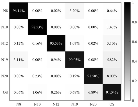 Confusion matrix of N8 (Scenedesmus sp.), N10 (Lagerheimia ciliata), N12 (Selenastrum capricornutum), N19 (Cyclotella meneghiniana), N20 (Microcystis sp.), and other species (OS).