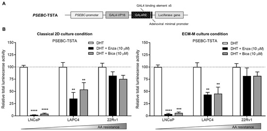 To ensure that ECM-M culture conditions did not interfere with the detection of AR transcriptional activity using our biosensor, we tested if PSEBC-TSTA (Figure 3A) could still monitor bulk cell line sensitivities to ARi in our model. PCa Ari-sensitive (LNCaP, LAPC4) and -resistant (22Rv1) cells were infected with PSEBC-TSTA and exposed to the following treatments: DHT (AR agonist (1 nM)), DHT + Enza (10 µM) or DHT + Bica (10 µM) [42,43]. Total luminescence activity was measured for each treatment group and was normalized to the DHT-only treated group (Figure 3B). Under DHT + Enza (10 µM) and DHT + Bica (10 µM) treatments in 2D classical culture conditions, the total luminescence activity decreased to 2.0% and 4.3% in LNCaP and to 35.4% and 53.9% in LAPC4, respectively, when compared to DHT alone. In ECM-M culture conditions, total luminescence activity decreased to 3.7% and 6.2% in LNCaP and 43.6% and 45.5% in LAPC4, under Enza and Bica treatment, respectively, in comparison to DHT alone. In the AA-resistant 22Rv1 cell line, the AR luminescence activity signal in both classical 2D and ECM culture conditions remained high under Enza (82.2% and 81.7%, respectively) or Bica (75.4% and 81.8% of DHT group, respectively) treatments (Figure 3B). Overall, these results show that the ECM-M culture condition is, therefore, suitable to monitor AR activity and, thus, ARi sensitivity in PCa cell lines.