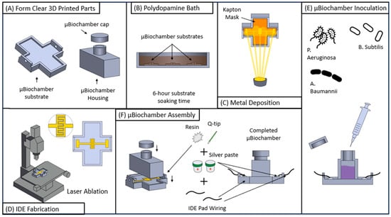 Process flow for the µbiochamber. (A) Three-dimensional printed substrate, cap, and inoculation chamber. (B) Six-hour polydopamine bath. (C) stencil mask and Ti/Au deposition. (D) Laser ablation to fabricate the IDE (E) µbiochamber chamber assembly. (F) Inoculation of various bacteria.