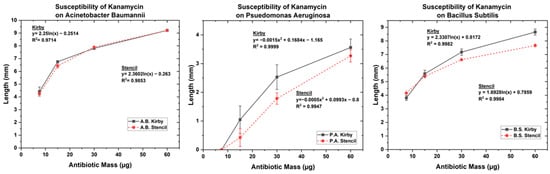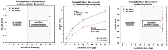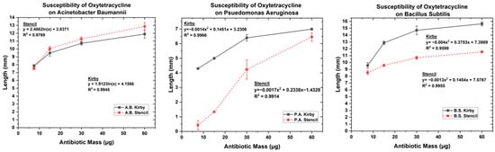 The results of the MIC are shown in Table 2. Our findings show that the radius and stencil area of inhibition for the antibiotics both changed with the different bacteria, as shown in Figure 3, Figure 4 and Figure 5. The MIC showed high resistance to streptomycin and penicillin G; however, P. aeruginosa was susceptible to streptomycin, and B. subtilis was susceptible to penicillin G. The MIC results showed that A. baumannii and B. subtilis possessed high susceptibility for both kanamycin and oxytetracycline, while P. aeruginosa showed intermediate susceptibility. The governing equations regarding the growth inhibition for P. aeruginosa, A. baumannii, and B. subtilis in the presence of oxytetracycline, kanamycin, streptomycin, and penicillin G follow one of the two equations below.