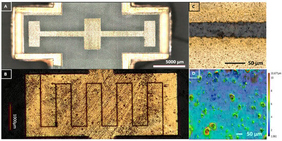 (A) Image of the metal deposition after stencil mask removal. (B) Center pad after laser IDE ablation. (C) Laser confocal image of IDE gap. (D) Laser confocal height map of surface roughness of resin substrate.
