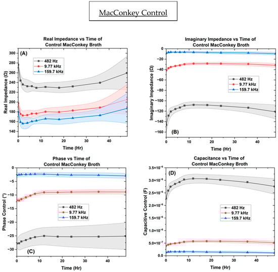 Throughout the impedance measurements, as the alternating current passes through the MacConkey media containing the microbial growth, the metabolic activities become electrically detectable due to the nutrients and ionic efflux components from bacteria in the media [,]. Below in Figure 7, we can observe that the control provided stable measurements in real impedance, imaginary impedance, phase, and capacitance in the frequency points of 482.31 Hz, 9.7 kHz, and 159.7 kHz, respectively. The real impedance provides results that are stable between [229 ↔ 276 Ω], [172 ↔ 205 Ω], [156 ↔ 187 Ω] across the 48 h. For the imaginary impedance, the control remained stable [−107 ↔ −146 Ω], [−28 ↔ −41 Ω], and [−6 ↔ −9 Ω] across the same frequencies. The phase results were also stable between [−25 ↔ −27°], [−6 ↔ −9°], and [−8 ↔ −12°], reaching equilibrium in 8 h at the same frequency points, respectively. For the capacitance, the recurring measurements remained between [2.27 ↔ 3.07 µF], [0.39 ↔ 0.52 µF], and [0.11 ↔ 0.16 µF], reaching equilibrium in 8 h. Figure S2 shows the surface of the control IDE in the SEM after 18 and 48 h.
