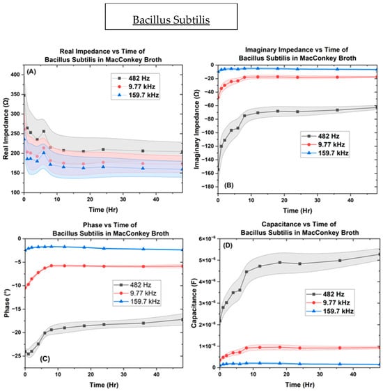 In Figure 8, results from the various impedance measures for B. subtilis when it is inoculated into the µbiochamber at a concentration of OD600 = 1.0 for 48 h at frequency points of 482.31 Hz, 9.7 kHz, and 159.7 kHz. The real impedance varied between [204 ↔ 348 Ω], [170 ↔ 261 Ω], and [159 ↔ 235 Ω] across the 48 h time frame. The values for the imaginary impedance were [−62 ↔ −154 Ω], [−17 ↔ −48 Ω], and [−5 ↔ −10 Ω]. The phase values measured between [−17 ↔ −25°], [−5 ↔ −11°], and [−1.6 ↔ −2.51°], reaching equilibrium in 8 h, while the capacitance measured between [2.17 ↔ 5.27 µF], [0.34 ↔ 0.94 µF], and [0.1 ↔ 0.21 µF], reaching equilibrium in 8 h. Figure S3 shows B. subtilis biofilm growth over time.