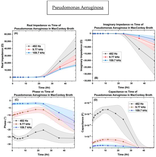 This change is also indicated to begin for P. aeruginosa at the 18 h mark, as shown by the rise in real impedance, decrease in imaginary impedance, and sharp decrease in capacitance. These quantitative characteristics allow for the determination of unknown samples as the ranges for the various bacteria are delineated from one another at the separate single frequency point values, with the widest range occurring at 9.77 kHz.