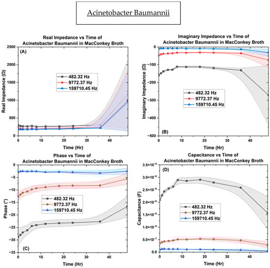 Figure 7, Figure 8, Figure 9 and Figure 10 depict the change occurring within the IDE vs. time at the three selected frequencies of 482.32 Hz, 9772.37 Hz, and 159,710 Hz for the B. subtilis, P. aeruginosa, and A. baumannii strains of bacteria. In Figure 11, the separation of bacteria is shown with a high standard deviation shown in supplementary belonging to P. aeruginosa, which could be due to P. aeruginosa’s ability to have large genetic diversity, phenotype plasticity, and heterogeneity in clinical isolates []. It was also shown that after the 11th hour, P. aeruginosa reached a high experimental value of 1015 Ohms, by Chabowski et al. []. When this data was subtracted by the MacConkey broth control (Figure 12), it is observed in the capacitive analysis, the lag adaption phase occurs between 0 ↔ 2 h and the log phase between 2 ↔ 6 h, which is characterized by the sharp rise of P. aeruginosa and B. subtilis. The stationary phase occurs between 8 ↔ 12 h for P. aeruginosa following bacterial growth curves, and B. subtilis shows a stationary phase from 8 ↔ 36 h. The capacitive effect of A. baumannii is not indicative of a substantial increase in bacterial growth; however, the sharp rise is observed in the phase graph at 36 h, indicating that A. baumannii’s stationary phase changes at 36 h as indicated in the rise in real impedance and phase along with the gradual decrease in capacitance [,].