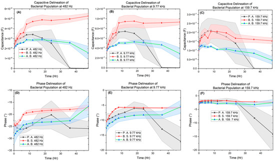 Image of capacitive (Top) and phase (Bottom) bacterial delineation plots. (A) Capacitance and (B) phase at 482 Hz. (B) Capacitance and (E) phase at 9.77 kHz. (C) capacitance and (F) phase at 159.7 kHz. The lower impedance frequencies 482 and 9.77 kHz show more separation than 159.7 kHz.