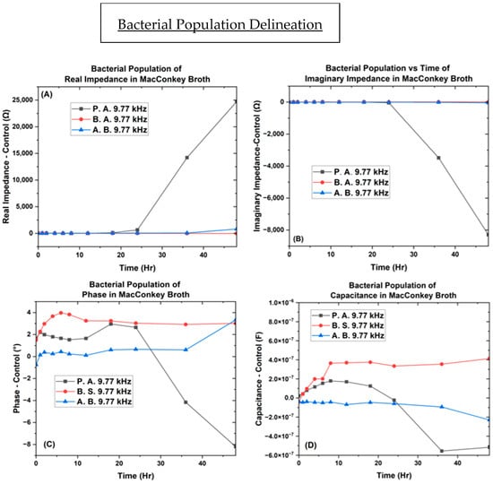 Bacterial population separation plot. Bacteria in MacConkey broth on the interdigitated electrode depicting the (A) real impedance vs. time, (B) imaginary impedance vs. time, (C) phase vs. time, and (D) capacitance vs. time.