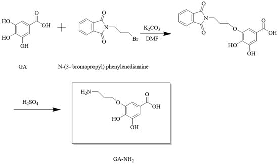 A novel hapten with GA moiety and a linear carbon chain was designed. It was synthesized according to the route shown in Figure 1. Briefly, GA (1.37 g), N-(3-bromopropyl) phenylenediamine (1.115 g), and K2CO3 (1 g) were dissolved in DMF (35 mL) and reacted at 40 °C for 2 h. The solution was extracted three times with ethyl acetate (100 mL) and washed three times with water (200 mL). The organic phase was added with water (50 mL) and 98% H2SO4 (25 mL). Then, hydrolysis reaction was carried on under acidic conditions at 25 °C for 3 h. The resulting solution was recrystallized to obtain hapten (GA-NH2). The hapten was characterized by HPLC and HRMS.