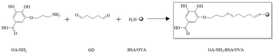 Immunogen GA hapten BSA (GA-NH2-BSA) and coating antigen GA hapten ovalbumin (GA-NH2-OVA) were produced by coupling GA-NH2 with BSA and OVA according to the synthesis route shown in Figure 2. Briefly, GA-NH2 (4.7 mg) was dissolved in PBS (pH 7.4, 0.01 M, 2 mL), followed by the addition of glutaraldehyde (GD, 50%, 50 μL), and then reacted at 25 °C (controlled by thermostat) for 4 h. Then, the system was mixed with BSA solution (40 mg BSA dissolved in 4 mL of 0.01 M PBS) dropwise and reacted at 25 °C for 24 h. The resulting solution was dialyzed in PBS (pH 7.4) at 4 °C for 72 h to isolate GA-NH2-BSA (16.31 mg). The same method was used to prepare GA-NH2-OVA (17.55 mg). Both GA-NH2-BSA and GA-NH2-OVA were identified by MALDI-TOF.