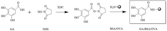 To compare the influence of the carbon chain length, the immunogen (GA-BSA) and coating antigen (GA-OVA) without carbon chain were prepared via an active ester method [19]. The synthesis route is shown in Figure 3. The dose of GA, BSA, and OVA were 4.7, 40, and 40 mg, respectively. The yields of GA-BSA and GA-OVA were 15.56 and 16.08 mg, respectively.