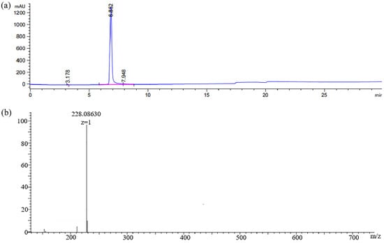 In this work, the hapten GA-NH2 was acquired by introducing a linear carbon chain to the GA structure. Its purity (95%) was determined by HPLC (Figure 4a). HRMS (Figure 4b) showed [M + H]+: 228.08665 (theoretical value) and 228.08630 (measured value).