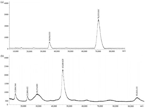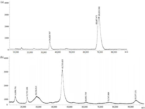 MALDI-TOF spectra of (a) immunogen GA-BSA and (b) coating antigen GA-OVA.