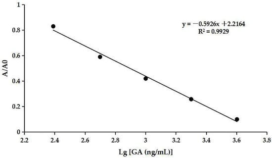 The concentrations of coating antigen and mAb were set to the determined optimum concentrations. The standard working solution of GA with different concentrations was set to 250, 500, 1000, 2000, 4000 ng/mL. The relevant steps for the envelope, block, and addition of different concentrations of the GA standard working solution, mAb, GaMIgG-HRP, TMB chromogenic solution, and stopping solution were the same as reported in Section 2.5.2. The absorbance was measured at 450 nm. The competitive inhibition curve for a quantitative analysis of GA was established, and the optimal detection range for GA could be calculated with the concentration of the analyte providing a 20–80% inhibition rate (IC20–IC80 values) [13]. The detection sensitivity could be calculated with the concentration of the analyte providing a 50% inhibition rate (IC50) [21]. Based on the established ic-ELISA standard curve, the GA analogues (syringic acid, protocatechuic acid, benzoic acid, caffeic acid, ferulic acid, and eugenol) were used to determine the cross-reaction rates.