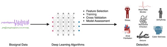 The process of utilizing deep learning algorithms for the detection of various health conditions using biosignal data, where physiological signals are fed as input to a deep learning model that makes a prediction of a health event of interest.