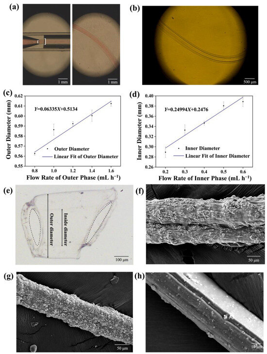 The cross section of the hollow fiber was observed with an inverted optical microscope (Eclipse TS2, Nikon, Tokyo, Japan). The microscale morphology of hollow fiber was further characterized by scanning electron microscopy (SEM; S4800, Hitachi, Tokyo, Japan). The crystal structure of the fibers was analyzed by X-ray diffraction (XRD; Model: ultima IV, Riigaku, Tokyo, Japan). To study the effects of flow rates and diameters of hollow fibers, the preparation process was recorded by an inverted optical microscope (Hunan Ketianjian Photoelectric Technology Co., Ltd., AcutEye-2M-169, Changsha, Hunan, China) equipped with a CCD high-speed camera (Phantom, Wayne, NJ, USA). Image analysis of the hollow fiber was performed using ImageJ 1.54c software (http://rsb.info.nih.gov/ij/, accessed on 8 March 2023).