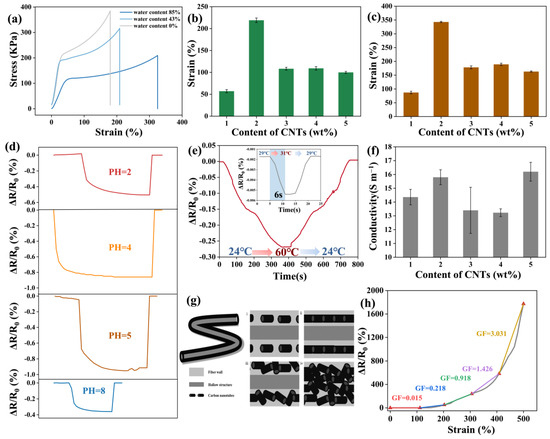 Property characterization and morphology of HollowFiber-CNTs. (a) Stress–strain curve of hollow fibers with different water contents. (b) Relationship between the content of CNTs and the electrical conductivity of hollow fiber. (c) Relationship between CNT content and hollow fiber tensile rate after soaking in LiCl. (d) Changes in the relative resistances of HollowFiber-CNTs at different pH values. (e) Changes in the relative resistance and response time of HollowFiber-CNTs at different temperatures. (f) Relationship between CNT content and hollow fiber tensile rate. (g) Alignment of CNTs with different contents inside hollow fiber. (h) Relationship between tensile rate and GF of HollowFiber-CNTs. Data are presented as mean ± SD (n = 3).