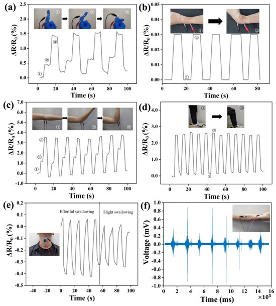 Applications of HollowFiber-CNTs for detecting human motion. (a) Relative resistance changes of HollowFiber-CNTs with finger joint bending to different angles. (b) Relative resistance changes of HollowFiber-CNTs with wrist bending to different angles. (c) Relative resistance changes of HollowFiber-CNTs with elbow bending to different angles. (d) Relative resistance changes of HollowFiber-CNTs with knee bending to different angles. (e) Relative resistance changes of HollowFiber-CNTs with varying degrees of swallowing. (f) HollowFiber-CNTs detection of electromyographic signals.
