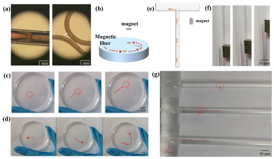Directional movement of nano-doped hollow fiber. (a) Preparation process of magnetic hollow fibers and the resultant magnetic hollow fibers. (b) Schematic diagram of the magnetic control of directional movement of the directional micromotor. (c) Magnetic force controls the movement of a directional micromotor along a straight line. (d) Movement of the directional micromotor along a curve. (e) Schematic diagram showing the manipulation of the directional micromotor in a channel. (f) Manipulation of the directional micromotor in a vertical channel. (g) Manipulation of the directional micromotor in a T-shaped channel.