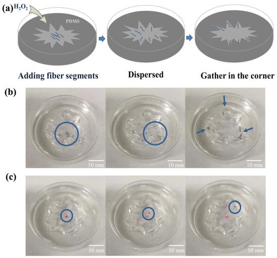 In bubble-propelled micromotors, polydimethylsiloxane was used to make molds with complex cavities and put into the petri dish. The functionalized hollow fiber was cut into pieces and put into the cavity of a petri dish filled with H2O2 to test its motion. The reaction is based on the following chemical equation: