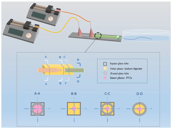 A micropipette puller (PUL-100, World Precision Instruments, Inc., Sarasota, FL, USA) was used to prepare the capillary-based microfluidic device. Two cylindrical capillaries (World Precision Instruments, Inc., Sarasota, FL, USA) with inner diameters of 0.58 mm and outer diameters of 1 mm were tapered by the micropipette puller to obtain an injection section and a collection section, respectively. Their tips were polished to the desired diameter using fine sandpaper. The capillary microfluidic device consists of a glass slide and a group of nested glass capillaries. Two injection needles were encapsulated at the capillary junction. Two cylindrical capillaries with tips were placed in a square glass capillary (1.4 mm × 1.1 mm, Beijing Chengteng Equipment Co., Ltd., Beijing, China), aligned coaxially, and glued together with AB glue (5 Minute Epoxy, Deli Group Co., Ltd., Ningbo, Zhejiang, China) to obtain nested capillary groups. At the end of the collection section, a petri dish was placed, filled with calcium chloride (5 wt%) solution to solidify the generated hollow fiber.