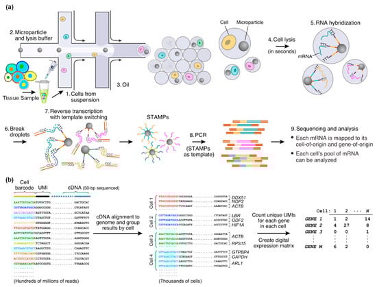 Schematic of the Drop-seq single-cell RNA-sequencing steps is illustrated. (a) The library preparation steps are shown. Single cells are separated from a tissue to form the single-cell suspension, which then forms the first aqueous phase to be injected into the microfluidic chip. The other aqueous phase carries the barcoded beads suspended in a lysis buffer. The droplet-based microfluidic chip in a T-junction joins these two aqueous flows, where they form the discrete phase (i.e., droplets encapsulating the required materials) in an oil continuous phase. In the formed microdroplets, the single cells are lysed, and their mRNAs are captured with the primers on the microparticles. Then, the droplets are broken, and the collected mRNAs are reverse-transcribed, forming STAMPs. After PCR, NGS and analysis are performed. (b) The analysis steps after sequencing are shown. Sequencing reads are aligned to a reference genome to find the gene of origin of the cDNA. Also, they are organized based on their cell barcodes to count UMIs for each gene in each cell, based on which the expression matrix is extracted. Reprinted from [60], with permission from Elsevier Copyright 2015 Elsevier Inc.