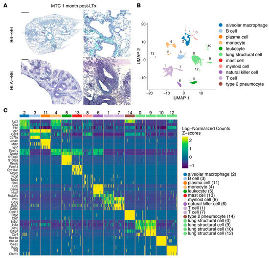 (A) Histology sections of control (B6→B6) and bronchiolitis obliterans syndrome (HLA→B6) mouse lung graft one month post-transplantation. Scale bars, 500 μm. Zoomed views are shown on the right. (B) UMAP plots of 11 cell populations. (C) Heatmap illustrating most upregulated genes in each cell cluster. The figure is taken with permission from [136] under Creative Commons Attribution 4.0 International License (https://creativecommons.org/licenses/by/4.0/), accessed on 1 February 2024).