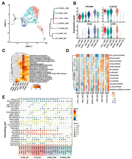 Single-cell RNA-sequencing of endothelial cells after liver transplantation. (A) UMAP plot presenting seven endothelial cell clusters (left). Dendrogram of the seven clusters (right). (B) Violin plots demonstrating the normalized expression of PECAM1, CLEC4G, CD34, and LYVE1 genes. (C) Gene Ontology enrichment analysis results. (D) Gene set variation analysis identifying the pathways. Different colors stand for different activation scores. (E) Cell-cell interaction analysis between mononuclear phagocyte clusters and different endothelial cell clusters. The circle size stands for the level of p-value. Colors stand for different mean values. The figure is taken from [153] with permission under a Creative Commons Attribution 4.0 International License (http://creativecommons.org/licenses/by/4.0/, accessed on 1 February 2024).