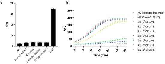 - Li, F.; Ye, Q.; Chen, M.; Xiang, X.; Zhang, J.; Pang, R.; Xue, L.; Wang, J.; Gu, Q.; Lei, T.; et al. Cas12aFDet: A CRISPR/Cas12a-based fluorescence platform for sensitive and specific detection of Listeria monocytogenes serotype 4c. Anal. Chim. Acta 2021, 1151, 338248. [Google Scholar] [CrossRef] [PubMed]
