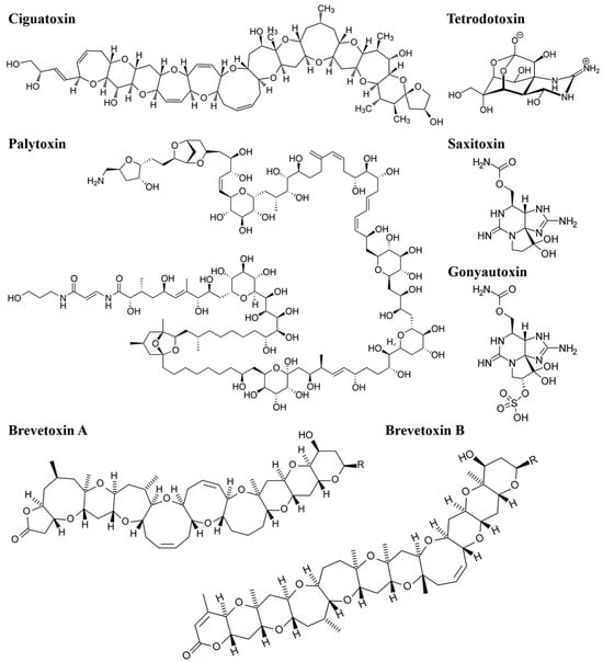 Alkaloid toxins are nitrogen-containing compounds with complex carbon structures, often found as secondary metabolites in marine organisms. Common alkaloid toxins include tetrodotoxin (TTX), saxitoxin (STX), and gonyautoxin (GTX) (Figure 2). TTX, an amino pyrroloquinazoline-type neurotoxin, exists in puffer fish and other organisms, primarily paralyzing nerves and muscles. STX, initially discovered in clams and mussels, is recognized as one of the most potent MBs and functions as a guanidinoamine neurotoxin []. GTX is a guanidine neurotoxin produced by gondola and can be divided into GTX1, GTX2, GTX3, and GTX4 [].
