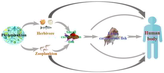 MBs primarily originate from marine microorganisms and algae, affecting a broad spectrum of species. These toxins can be categorized into two types: non-acquired and acquired. Non-acquired toxins are synthesized directly by the organisms themselves, mainly by marine bacteria, fungi, and algae. In contrast, acquired toxins are not produced by the organisms themselves but are accumulated through the food chain and environmental exposure. These toxins are predominantly found in fish, shellfish, and shrimp. MBs are known for their notable stability, persisting within marine organisms and their environments. As depicted in Figure 3, MBs in the marine environment are primarily produced by microorganisms and algae. These toxins accumulate in marine organisms either directly from the environment or through processes such as predation, parasitism, and symbiosis. Due to their relative stability, the accumulation of these toxins increases with each level of the marine food chain.