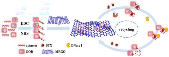 Among fluorescent labeling materials, fluorescent dyes are commonly employed due to their diverse color range, intense fluorescence, and compatibility with biological molecules. For instance, Liu et al. developed a method using Cy3-labeled aptamers and AuNPs@MIL-101, achieving a tetrodotoxin detection range of 0.01~300.00 ng/mL with a limit of detection (LOD) as low as 6.00 pg/mL. QDs possess biocompatibility, high-fluorescence yields, and photostability, along with tunable emission spectra []. STX was detected using graphene quantum dots (GQDs) and nuclease-assisted target cycling signal amplification, as shown in Figure 4 []. The sensing mechanism involves the attachment of STX aptamer to the carboxyl group on the GQD surface via the amino group. Subsequently, the complex is adsorbed onto magnetized reduced graphene oxide (MRGO) through π-π stacking. During this process, the fluorescence is quenched by the MRGO. However, in the presence of STX, the STX aptamer–GQD complex dissociates from the MRGO surface, leading to the appearance of fluorescence signals. The detection range spans from 0.10 to 100.00 ng/mL, with an LOD as low as 0.035 ng/mL.