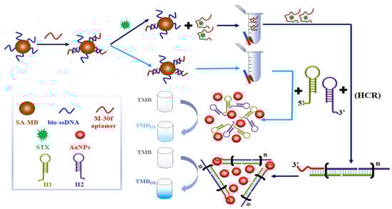 Colorimetric biosensors are mainly used for qualitative and quantitative analyses based on nanoparticle morphology as well as changes in state, enzymes, and chemical reactions caused by color changes observed by the naked eye. Nanoparticles used for colorimetric biosensing mainly include Au NPs and silver nanomaterials (Ag NPs) in various shapes, and Au NPs are commonly used nanomaterials for colorimetric biosensors. For example, Qiang et al. designed a colorimetric biosensor based on aptamer modulation of the state of Au NPs, which specifically binds to STX, causing the aggregation of Au NPs and a change in the solution color from red to purple or blue, with an LOD of 3.00 fg/mL []. However, the Au NPs are subjected to interferences of pH, temperature, organic solvents, and the sample mechanism, and aggregation occurs, resulting in false-positive results. To reduce the likelihood of false positives in detection, researchers investigate the use of color changes induced by enzymes or nanoenzymes catalyzing substrates as detection indicators. For instance, a colorimetric aptamer biosensor for the sensitive detection of STX based on the hybridization chain reaction (HCR) is depicted in Figure 6. When STX is present, the aptamer separates from the magnetic beads, triggering the hybridization chain reaction through magnetically separated aptamers to form HCP-dsDNAs-Au. This significantly enhances the catalytic ability to induce color changes in TMB, thereby amplifying the signal specific to STX []. The LOD of this colorimetric aptamer sensor was 42.46 pM, with high sensitivity. With the development of smartphone image acquisition and processing technology, colorimetric biosensors have attracted widespread attention for the rapid detection of MBs.
