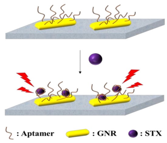 A surface plasmon resonance (SPR) sensor is based on variations in parameters such as refractive index, resonance angle, mass surface, and so on. Depending on the different mechanisms of action of the combination, different signal displays, and mathematical models of the data, a wide range of analytes, as well as ligand immobilization methods, can be developed for the rapid detection of MBs. SPR sensors have the advantages of high selectivity, high sensitivity, high throughput, real-time monitoring, and low sample consumption []. The effective immobilization of marine biotoxin antibodies on the chip directly affects the performance of SPR sensors. The development of a novel STX surface plasmon immunosensor is attributed to optimizing surface treatment on the sensor and improving mixing ratios and times, resulting in increased binding capacity of STX antibodies to the sensor surface []. Multichannel and multichannel instrumentation have led to the emergence of more advanced and stable SPR sensors []. With the development of marine biotoxin aptamer technology, more and more aptamer biosensors have been reported. For example, Ha et al. developed a localized SPR aptamer sensor, as shown in Figure 7, the biosensor modified gold nanorods via Au-S on a chip, and the STX aptamer was also modified on gold nanorods via Au-S []. When STX is present, STX binds to the aptamer, and the localized surface plasmon absorption spectra are shifted to achieve the detection of STX.