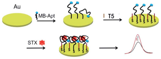 A simple electrochemical aptasensor for detection of STX using MB-Apt for recognition and signal output. Reproduced from [] with permission from Royal Society of Chemistry.