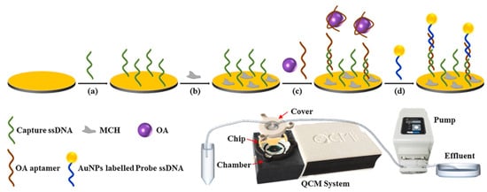 Piezoelectric aptasensor with Au NP amplification for the label-free detection of OA. Reproduced from [] with permission from Elsevier. (a–d) represents the order of the procedures.