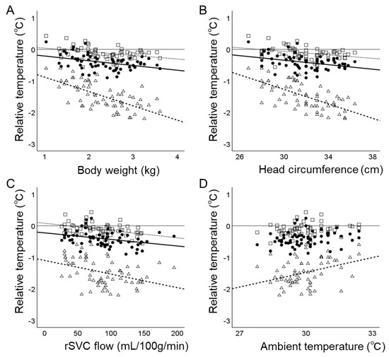 Relationships between relative brain temperature and clinical variables. The relative scalp and brain temperatures to rectal temperature (Tbrain-25 − Trectal, Tbrain-15 − Trectal, and Tscalp − Trectal) showed consistent negative relationships with body weight (A), head circumference (B), and rSVC flow (C). Tscalp − Trectal showed a positive relationship with the ambient temperature (D). Symbols: open triangle, Tscalp − Trectal; closed circle, Tbrain-15 − Trectal; open rectangle, Tbrain-25 − Trectal. Regression lines are from the simple linear analysis with p < 0.05 for Tscalp − Trectal (dashed), Tbrain-15 − Trectal (solid), and Tbrain-25 − Trectal (dotted).