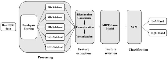 In this study, we propose an innovative framework for EEG signal classification. The algorithmic overview of this framework is illustrated in Figure 1. Specifically, we divide the original EEG signals into different time windows. Within each time window, we perform spectral analysis to obtain significant features of EEG signals in different frequency ranges. Secondly, we use the feature extraction algorithm of RG, which directly manipulates the covariance matrix of EEG signals in space. This step allows us to obtain structural information about the synergistic activity between brain regions. Then, we introduce the MIPF-LASSO model proposed in this paper, which provides an efficient and accurate feature representation for classification tasks by learning and selecting informative features. Finally, the obtained features are input into an SVM classifier to obtain the classification results.